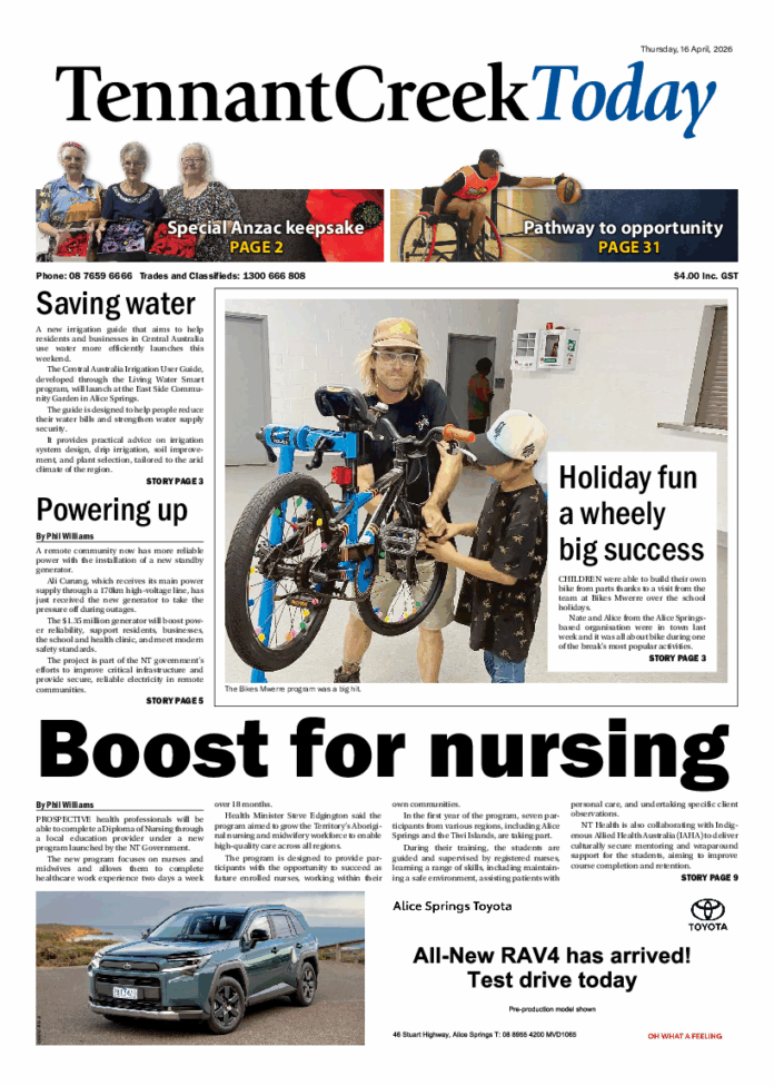 The Tennant Creek Today – 16th April 2026 Subscribe or Login to see the rest of the content. Username Password * Remember Me Forgot Password News First new light tower installed at oval 17/04/2026 One of the new light towers has been put in place at Jim McConville Oval as part of the upgrade to the sporting precinct. Contractors... Community unites for diabetes 17/04/2026 The Alice Springs community will come together to show support and recognise the daily challenges faced by people living with Type 1 diabetes through... Ellery Creek Big Hole claims disability advocate. 16/04/2026 A 35 year old woman who drowned at Ellery Creek Big Hole in the West Macdonnell Ranges on Sunday 12 April has been named...