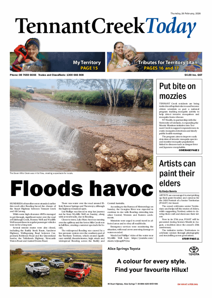The Tennant Creek Today – 26th February 2026 Subscribe or Login to see the rest of the content. Username Password * Remember Me Forgot Password News Alice warbird visitor deployed to UAE 12/03/2026 A Royal Australian Air Force (RAAF) Wedgetail aircraft, A30-004, that made a brief visit to Alice Springs in August last year has been deployed... More planes in the sky mean more care 11/03/2026 Five new flying intensive care units will help deliver more intensive care in the sky as part of the South Australia and Northern Territory... A Monster Pod for a monster run 10/03/2026 From a lounge room in Alice Springs, three trail runners have taken to the mic to chat about one of Australia’s toughest trail runs:...