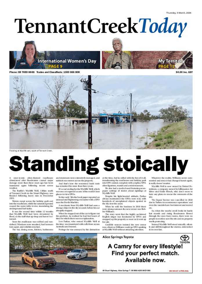 The Tennant Creek Today – 5th March 2026 Subscribe or Login to see the rest of the content. Username Password * Remember Me Forgot Password News Alice warbird visitor deployed to UAE 12/03/2026 A Royal Australian Air Force (RAAF) Wedgetail aircraft, A30-004, that made a brief visit to Alice Springs in August last year has been deployed... More planes in the sky mean more care 11/03/2026 Five new flying intensive care units will help deliver more intensive care in the sky as part of the South Australia and Northern Territory... A Monster Pod for a monster run 10/03/2026 From a lounge room in Alice Springs, three trail runners have taken to the mic to chat about one of Australia’s toughest trail runs:...