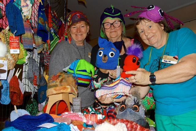 VOLLIES: Volunteer Beanieologists, Deb White, Gay Epstein and Deb Taylor-Thompson at the 2024 Alice Springs Beanie Festival. (Phil Williams: 414843_01)