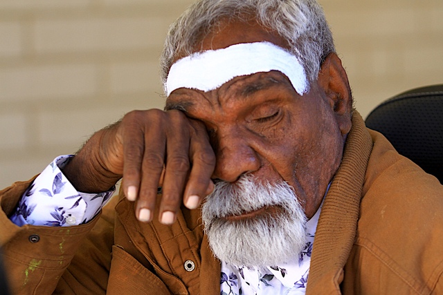 GRANDFATHER: Ned Jampijinpa, the grandfather of the Kumanjayi White who died following his arrest in Coles wipes away tears while speaking during a vigil in Alice Springs. (PIC: PHIL WILLIAMS 481525_03)