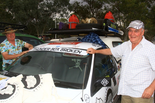 THUNDERBOX: Jock Christopher and Brendan Noonan put the final touches to their car on Friday before heading to the Gold Coast. (PHIL WILLIAMS 512919)