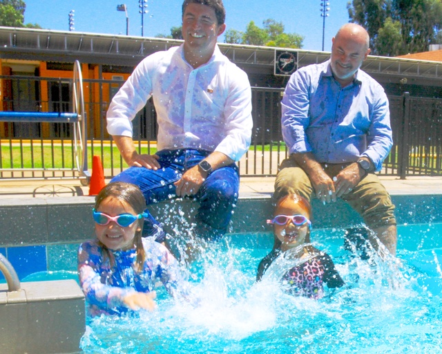 SLASH: Ministers Josh Burgoyne and Bill Yan watch on as Matilda Liddle and Violet Moult splash in celebration after learning the pool will have free entry during summer. (PIC: PHIL WILLIAMS 524505_04