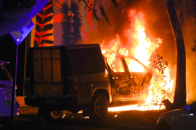 They then began pelting police with rocks and other projectiles before setting at least one police cage car on fire.