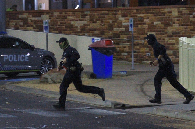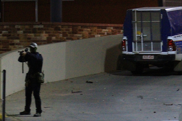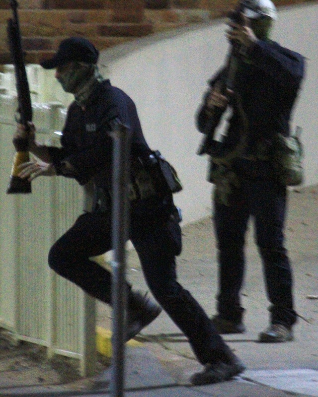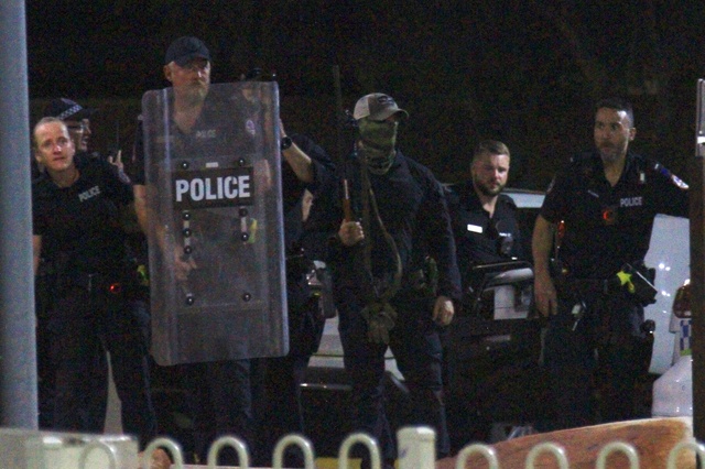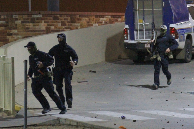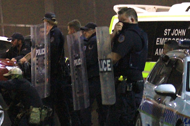 Police wearing riot gear and using shields to protect themselves fired tear gas, and reportedly rubber bullets, to disperse the crowd, with the mob eventually forced back from the hospital car park along Gap Road, while some of the group gathered on the forecourt of the service staion opposite..